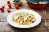 Włoski makaron z szynką i śmietaną w czarnej płycie w kuchni