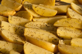 Apetyczne i piękne smażone ziemniaki, żółte, z przyprawami, zbliżenie