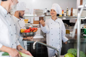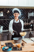 atrakcyjny czekoladowy w fartuchu dodanie białej czekolady chipsy do miski