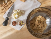 selektywne skupienie czekolady w czarnych rękawiczkach lateksowych z białymi wiórkami czekoladowymi