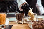 przycięty widok czekolady w czarnej rękawicy lateksowej dodanie suszonych malin na świeżo wykonane cukierki