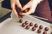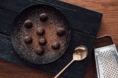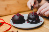 przycięty widok czekolady w czarnej rękawicy lateksowej z dodatkiem wiórów czekoladowych na świeżych cukierkach