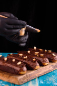 zbliżenie chocolatier gospodarstwa szczotka w pobliżu smaczne batoniki czekoladowe z orzechami laskowymi