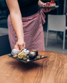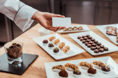 przycięty widok Czekoladowy stojący z zaciśniętymi rękami w pobliżu smacznych czekoladowych cukierków na talerzach