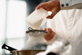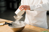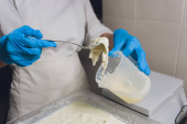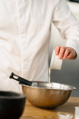 przycięty widok czekolady wylewanie roztopionej białej czekolady do miski trzymając skrobak ciasto