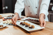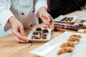 przycięty widok czekoladowego talerza dotykowego ze słodką czekoladą cukierki