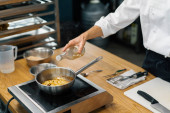 przycięty widok czekoladowy dodanie wiórów czekoladowych do miski na wagi kuchenne