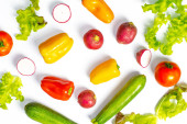 Zdrowe składniki sałatki na białym tle w twardym słońcu z ostrymi cieniami. Koncepcja posiłku wegańskiego
