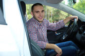 Młody, szczęśliwy biznesmen w samochodzie. Mężczyzna w garniturach stojący przy drogim, sportowym samochodzie. Udany młodzieniec..