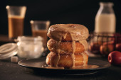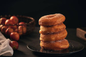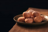Małe kulki ze świeżo upieczonych domowych pączków z twarogu w płytce na szarym tle.