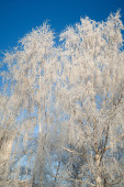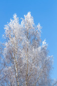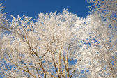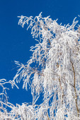 Szron na gałęzi drzewa w z bliska. Piękne zimowe tło z kryształków lodu pokryte gałęzi drzewa.
