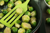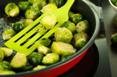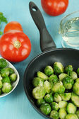 świeżej kapusty brukselskiej patelni na gotowanie powierzchni z bliska