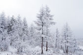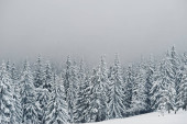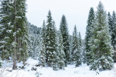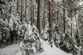 malowniczy widok na las sosnowy z wysokimi drzewami pokrytymi śniegiem