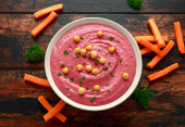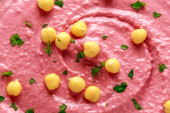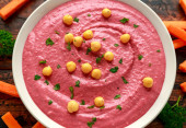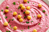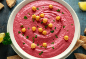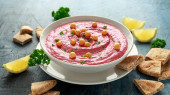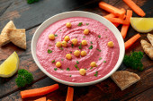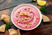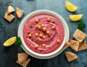 Hummus buraczany z ciecierzycą, oliwą z oliwek, cytryną i chlebem pita