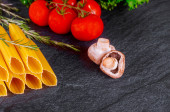Cannelloni suchy makaron z grzybami i pomidorami. Kuchnia włoska.