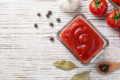 Płaska kompozycja świecka z sosem pomidorowym na niebieskim drewnianym tle