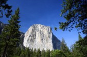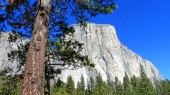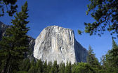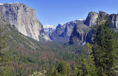 El Capitan granitowe skały, znany z zapierających dech w piersiach tras wspinaczkowych, widok z doliny Yosemite, Kalifornia, Usa. Pobliskie zabytki: Widok na tunel, Pół kopuły, Wodospad Bridalveil, Wodospad Koński, Wodospad Yosemite.