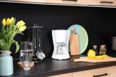 Zdjęcie "nowoczesne białe wnętrze kuchni z przyborami kuchennymi w pobliżu ściany z cegły" może być wykorzystywane do celów osobistych i komercyjnych zgodnie z warunkami zakupionej licencji Royalty-free. Obraz jest dostępny do pobrania w jakości wysokiej rozdzielczości do 5760x3840.