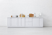 minimalistyczne białe wnętrze kuchni z przyborami kuchennymi i malowaniem na ścianie z cegły