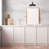 Zdjęcie "minimalistyczne białe wnętrze kuchni z przyborami kuchennymi i malowaniem na ścianie z cegły" może być wykorzystywane do celów osobistych i komercyjnych zgodnie z warunkami zakupionej licencji Royalty-free. Obraz jest dostępny do pobrania w jakości wysokiej rozdzielczości do 5760x3840.