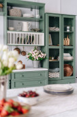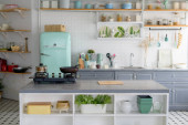 Zdjęcie "nowoczesne białe i turkusowe wnętrze kuchni z przyborami kuchennymi, pojemnikami spożywczymi i roślinami przy ceglanym murze" może być wykorzystywane do celów osobistych i komercyjnych zgodnie z warunkami zakupionej licencji Royalty-free. Obraz jest dostępny do pobrania w jakości wysokiej rozdzielczości do 5760x3840.