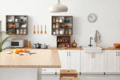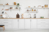 selektywne skupienie pustego blatu i minimalistyczne nowoczesne białe wnętrze kuchni z przyborami kuchennymi i jedzeniem w pobliżu cegły ściany na tle