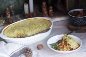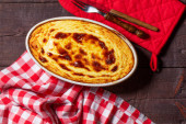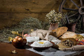 Rustykalne ciasto nadziewane mielonym kurczakiem i kalafiorem, a jesienna martwa natura na drewnianym tle. styl rustykalny.