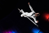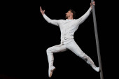 niski kąt widzenia człowieka bilansowania trzymając biegun metaliczny na arenie cyrku