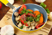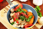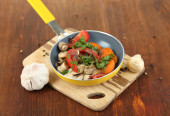Pokrojone świeże warzywa na patelni na drewniany stół szczegół