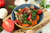 Zdjęcie "Pokrojone świeże warzywa na patelni na drewniany stół szczegół" może być wykorzystywane do celów osobistych i komercyjnych zgodnie z warunkami zakupionej licencji Royalty-free. Obraz jest dostępny do pobrania w jakości wysokiej rozdzielczości do 5760x3840.