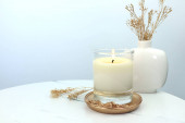 selektywne skupienie puszystej trawy ogonowej króliczka i palenie białych świec w szkle świecących na marmurowej białej powierzchni