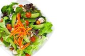Sałatka wegańska z pomidorami i papryką z rzodkiewkami w misce izolowane na białym tle.