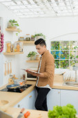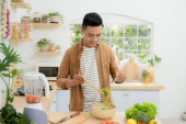 Uśmiechnięty młody człowiek robi sałatkę warzywną w kuchni w domu