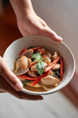 Tajskie jedzenie kurczaka zielony curry na drewnianym tle.