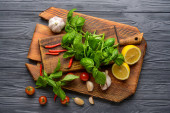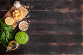 Zdjęcie "Składniki sosu pesto i talerz na drewnianym tle" może być wykorzystywane do celów osobistych i komercyjnych zgodnie z warunkami zakupionej licencji Royalty-free. Obraz jest dostępny do pobrania w jakości wysokiej rozdzielczości do 5760x3840.
