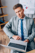 Przystojny projektant patrzy w kamerę trzymając szkice przy stole