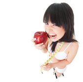 Młoda kobieta trzyma czerwone jabłko i uśmiecha się, odizolowany na białym tle