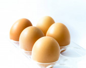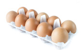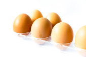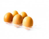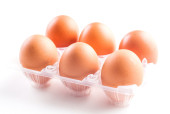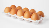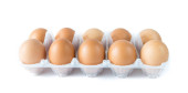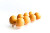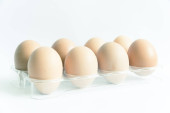 Studio nakręciło osiem surowych brązowych jaj na plastikowym opakowaniu izolowanym na białym