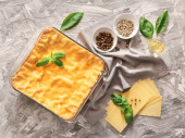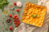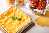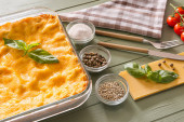 Naczynie do pieczenia z przygotowaną lasagną i składnikami na drewnianym stole