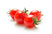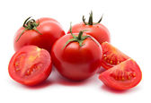 Całe i krojone świeże pomidory spadają na białe tło