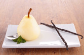pyszna gruszka w winie podawana na talerzu na serwetce na szarej betonowej powierzchni, zdjęcie panoramiczne