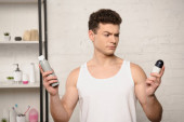 pozytywny młody człowiek w zielonej koszulce patrząc w kamerę trzymając dezodoranty