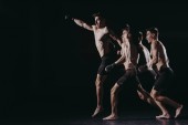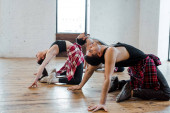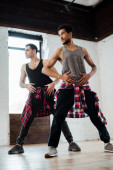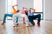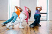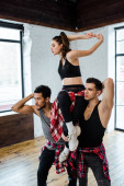 wielokulturowi mężczyźni i młoda atrakcyjna kobieta tańcząca jazz funk