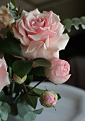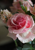 Bukiet róż i białych kwiatów, wspaniałe różowe i białe róże z jasnozielonymi liśćmi, delikatne pąki nieotwartych kwiatów i róż