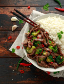 Zdjęcie "Domowej roboty wołowina i brokuły z ryżem i ziołami na drewnianym stole" może być wykorzystywane do celów osobistych i komercyjnych zgodnie z warunkami zakupionej licencji Royalty-free. Obraz jest dostępny do pobrania w jakości wysokiej rozdzielczości do 5760x3840.