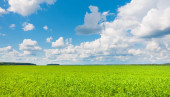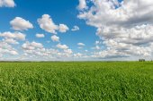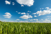 Piękny krajobraz, błękitne niebo i świeża zielona trawa. Zielona trawa i niebo w piękny słoneczny dzień.