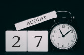 Koncepcja wydarzenia przypominającego kalendarz. Drewniane kostki z liczbami i miesiącem 27 sierpnia światłem słonecznym.