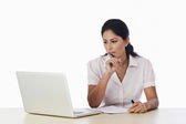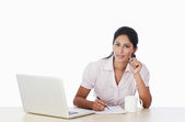 kobieta rozmawia przez telefon komórkowy przed laptopa