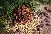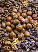 Różne orzechy w skorupie i bez niego rozrzucone na stole.