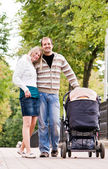 Szczęśliwa matka i ojciec pchania wózka dla dzieci na zewnątrz